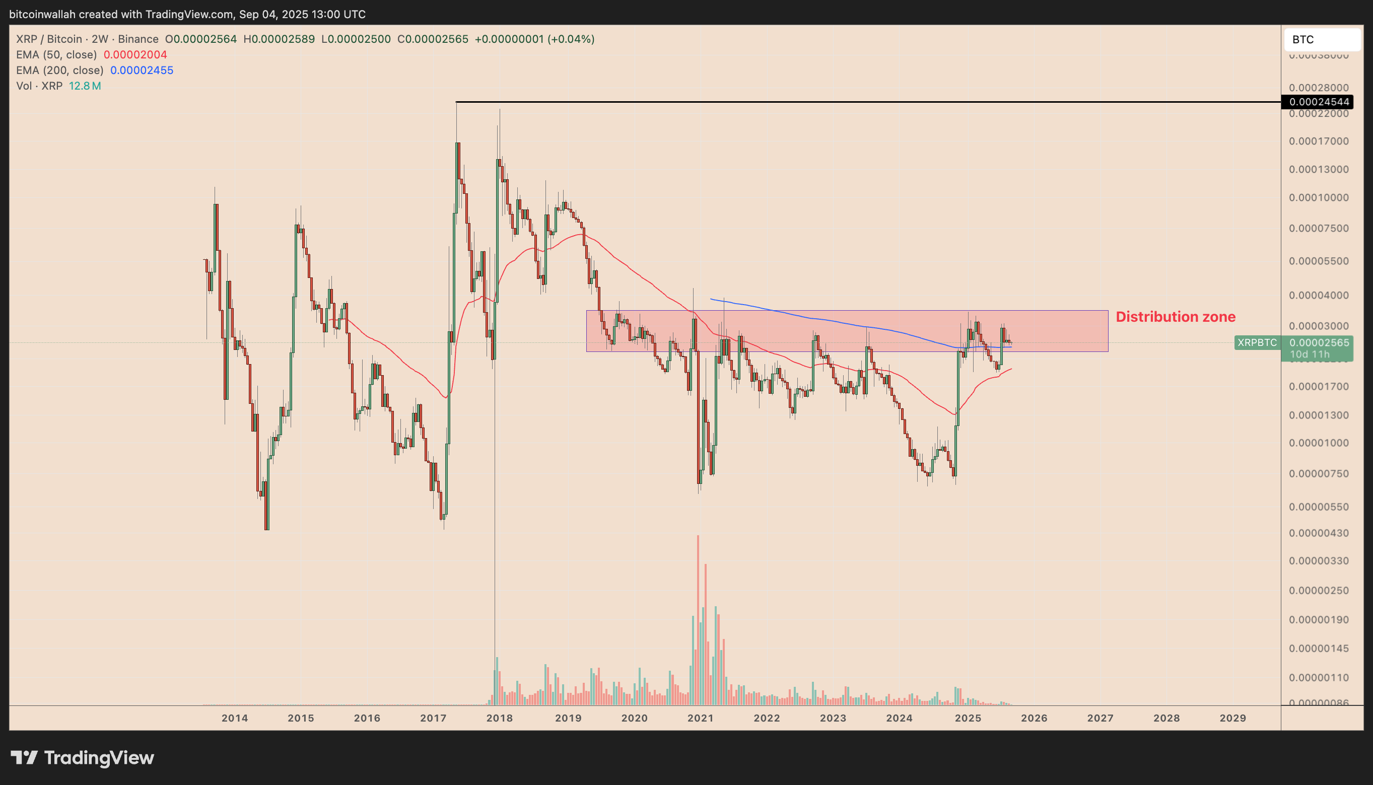 XRP/BTC eşitliği 2017 zirvesinin yüzde 90'ından azdır ve bir dağıtım alanında sıkışmıştır.