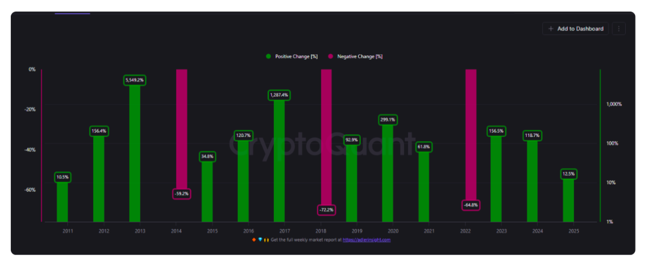 Bir zincir analiz platformu olan Cryptoquant, 2025'in yıllık Bitcoin yüzdesi eğilimi (BYPT) kullanarak mevcut döngüyü artırmanın son yılı olabileceğini öne sürdü.