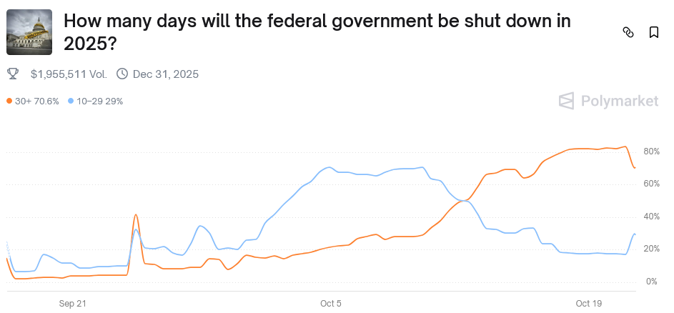 Hassett'in iyimserliğine rağmen Polymarket'ın hükümetin kapanmasının 30 günden fazla süreceği ihtimali %71. Bu, kapatmanın en az 31 Ekim'e kadar süreceği anlamına geliyor.