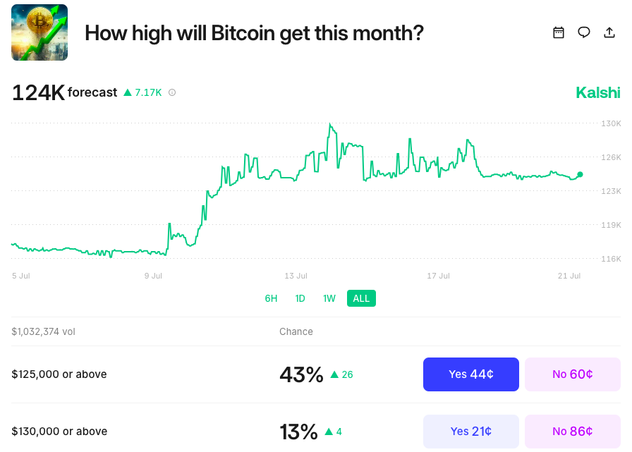 Tahmin servisi, Kalshi'nin Temmuz ayının ortalama tahmininde 124.000 dolar tercih ettiğini gösteriyor.