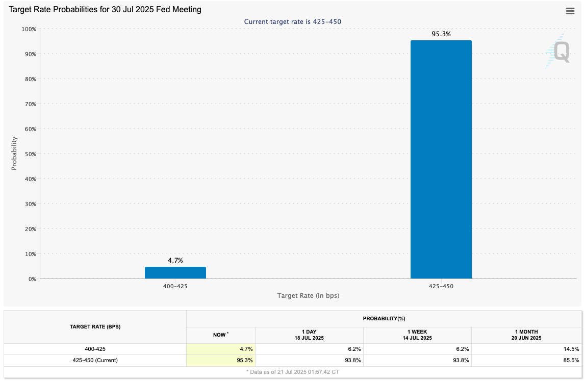 30 Temmuz'da yapılacak ve faiz oranının indiriminin uygun olup olmadığına karar verecek olan Federal Açık Piyasa Komitesi'nin (FOMC) toplantısından önce, piyasalar sonucun riskli faaliyetlerin lehine olacağına inanmamaktadır.