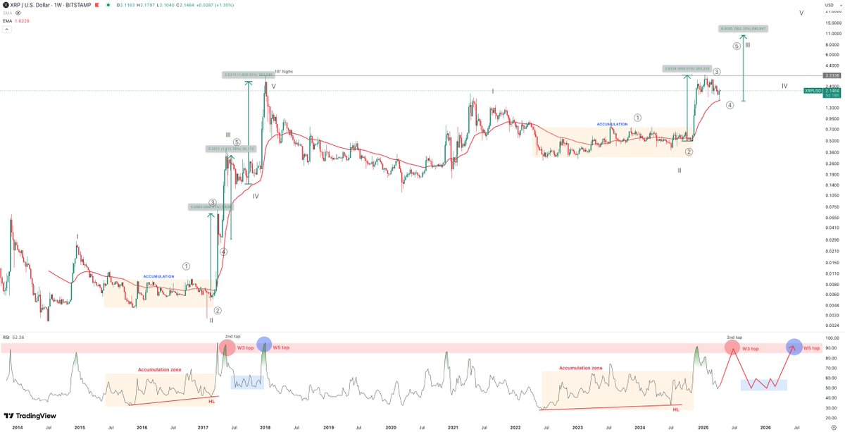 “Koruma durumu, XRP’nin W3’ünü tamamladığını, şu anda W4’ü tamamladığını ve son W5’e genişlemeden önce olduğunu varsayıyor.” Analist, fiyat hareketinin ve göreceli güç endeksinin (RSI) 2017 döngüsünü yansıttığını ve RSI değerinin direnç alanındaki (kırmızı) zirveye ulaştığını ve aşırı satın alma koşulları gösterdiğini de sözlerine ekledi.