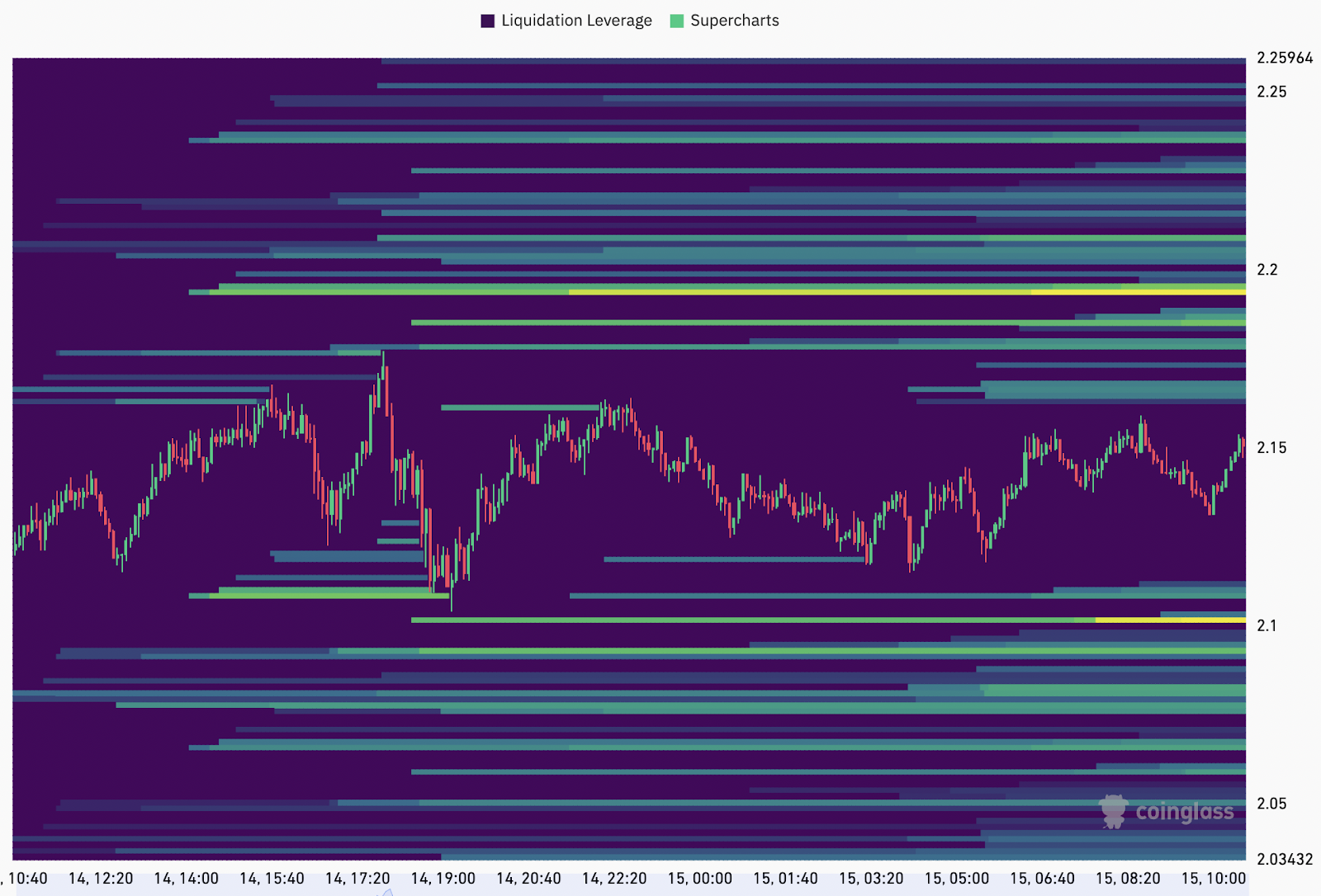 XRP’nin hemen bir desteği olan 2.10 dolar, 100 günlük üstel ortalama (EMA) ve tasfiye ısı haritasına kıyasla özellikle önemlidir.