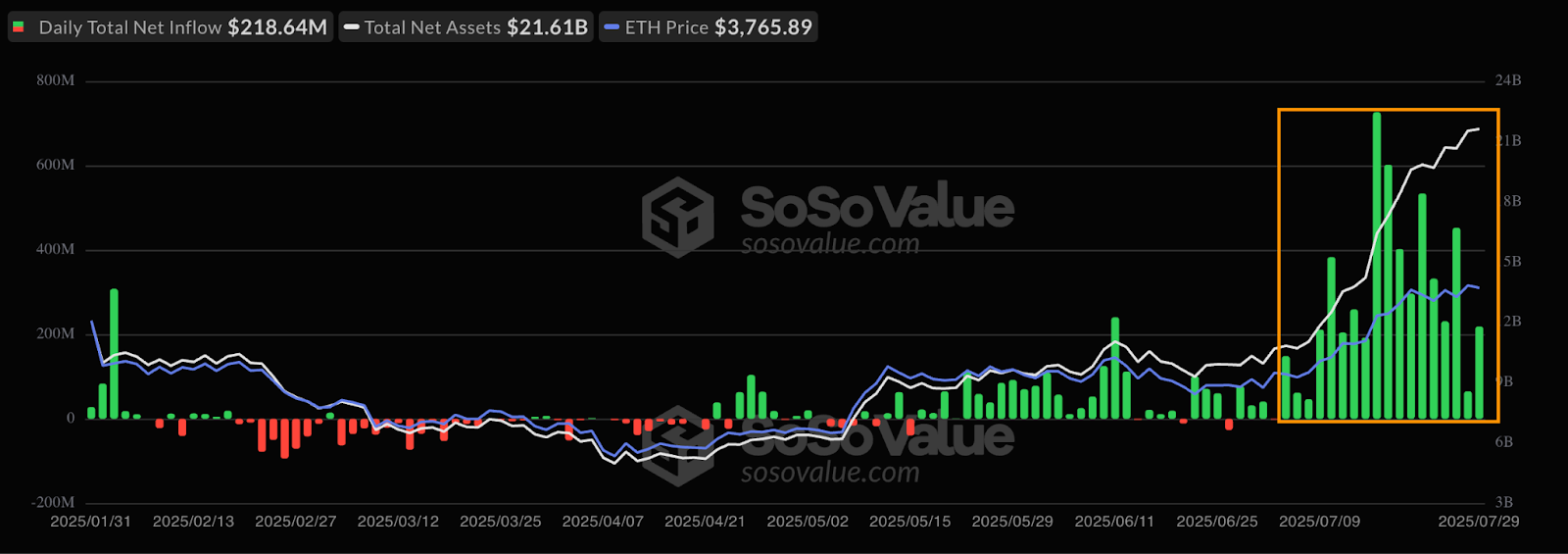 Salı günü 218 milyon dolarlık bir net giriş olan eter spot eterinin net girişi, 2 Temmuz'dan itibaren 18. olumlu günün ardışık bir gününü gösteriyor.