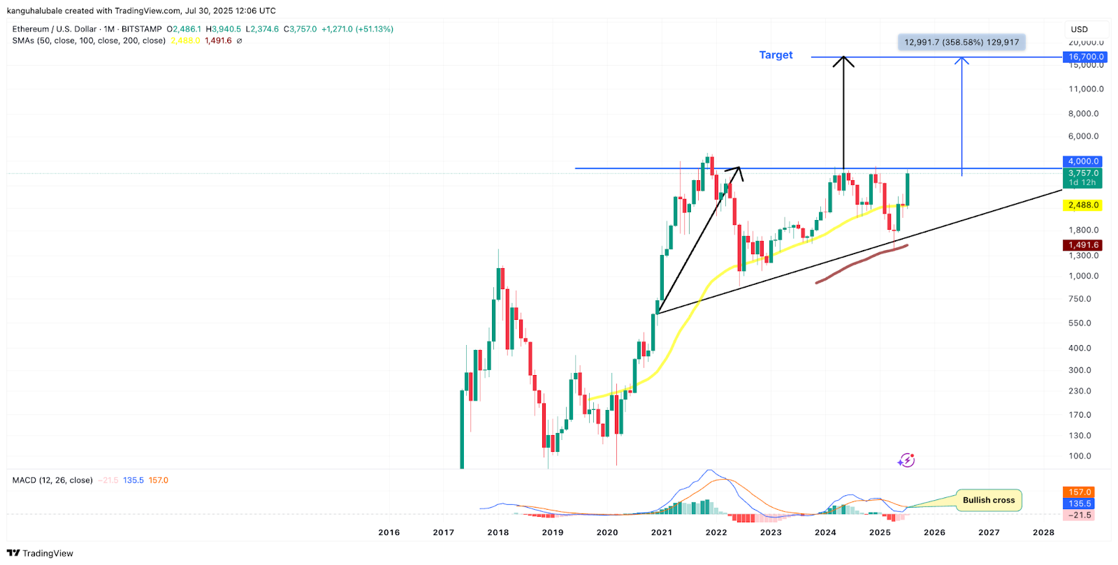 Bu, Ether'in 2025-2026 için kırılmasının hedefini yaklaşık 16.700 $ olarak belirliyor ve mevcut fiyat seviyelerine kıyasla yüzde 350'nin üzerinde bir artışla.
