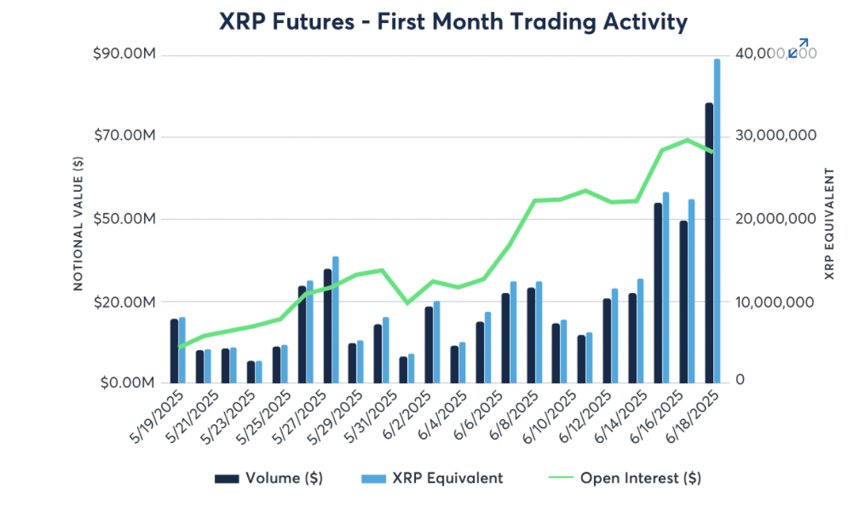 19 Mayıs'ta piyasaya sürülmesinden bu yana, standart işlem sözleşmeleri ve Micro XRP, toplam hacimde nominal işlemde 542,8 milyon doların üzerinde. CME Group'un son raporuna göre, bu kurumsal ve bireysel yatırımcıların güçlü ilgisini göstermektedir.