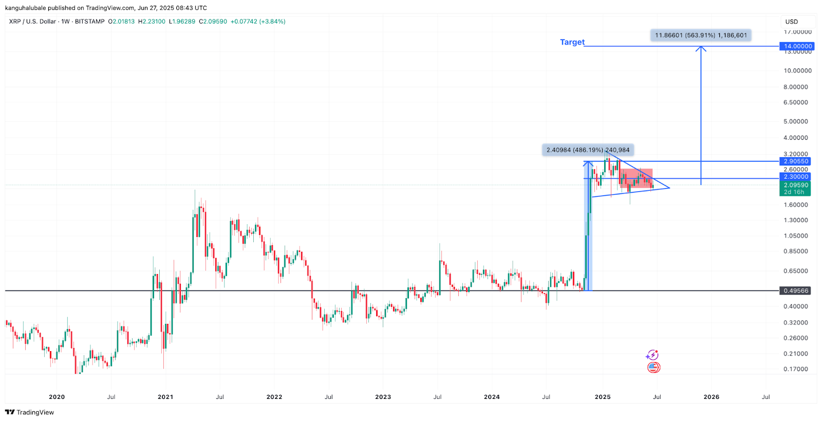 Alevden pozitif bir kırılma, XRP için aşağıdaki artışa başlayabilir ve mevcut seviyesinin yüzde 564'ünde bir artışla fiyatı 14 dolara getirebilir.