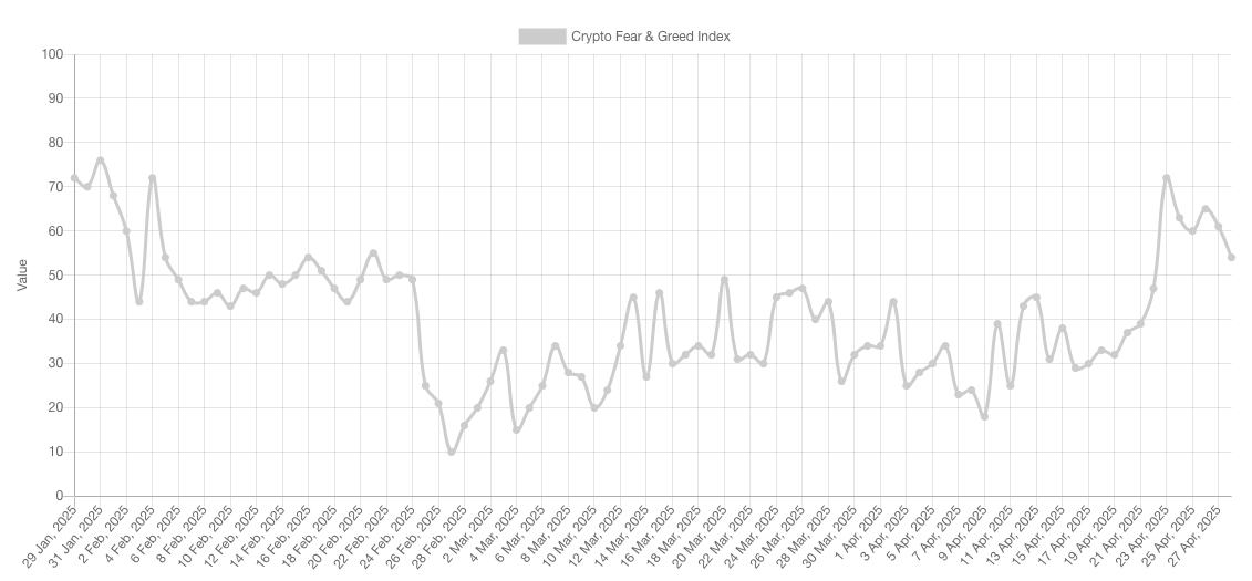 Kripto Korku ve Hırs Endeksi'nin en son verileri, 25 Nisan'da 72/100'e bir sıçrama olduğunu doğrulamaktadır, bu da şifreleme piyasası duygusunun “aşırı açgözlülük” yaklaştığını ima etmektedir.