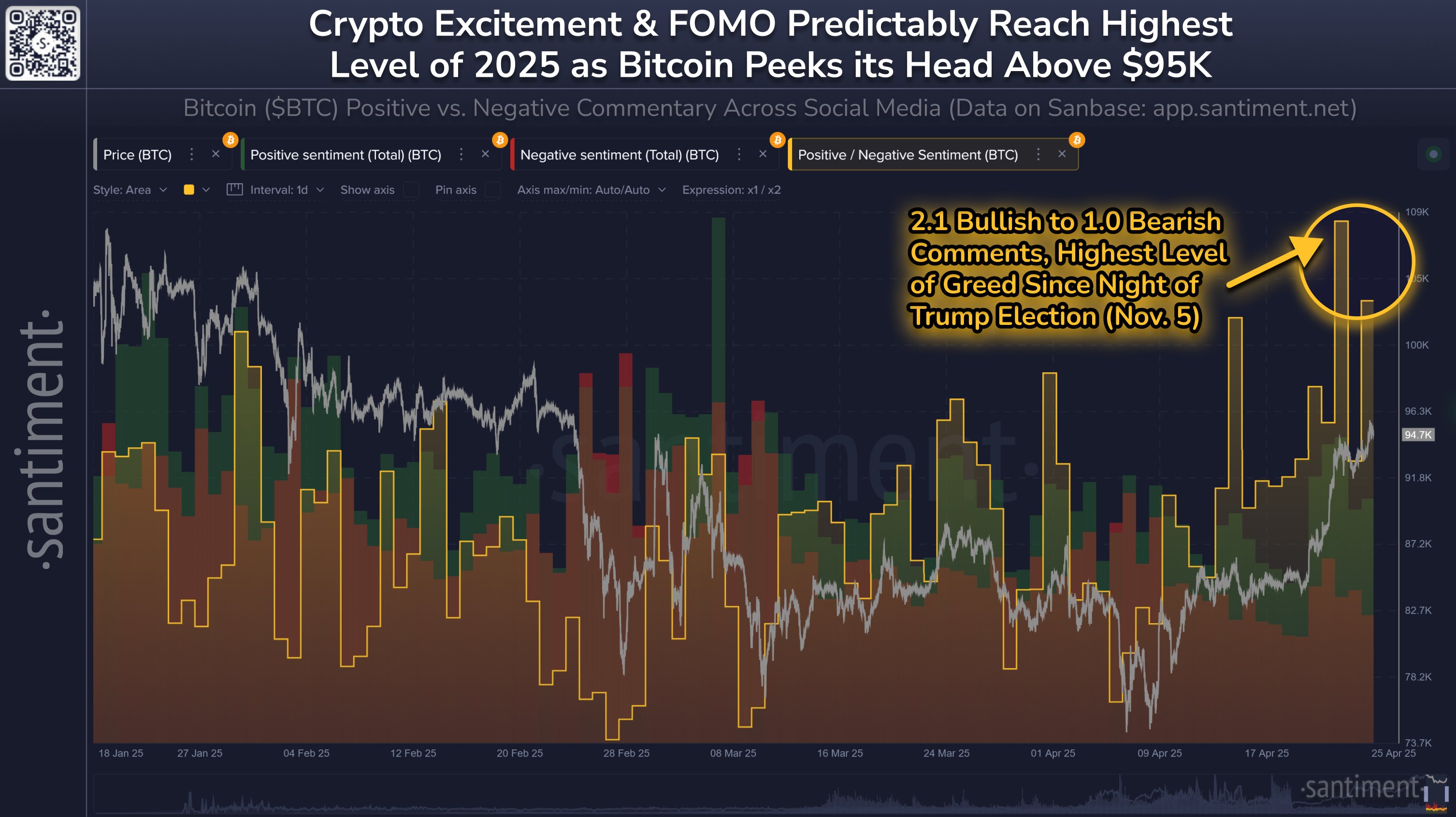 X takipçilerine, “Veriler, ilk kez BTC'nin Şubat ayından bu yana ilk kez 95.000 doların üzerinde arttığını ilk kez kalabalığın iyimserliğinde bir artış olduğunu gösteriyor.” Dedi.