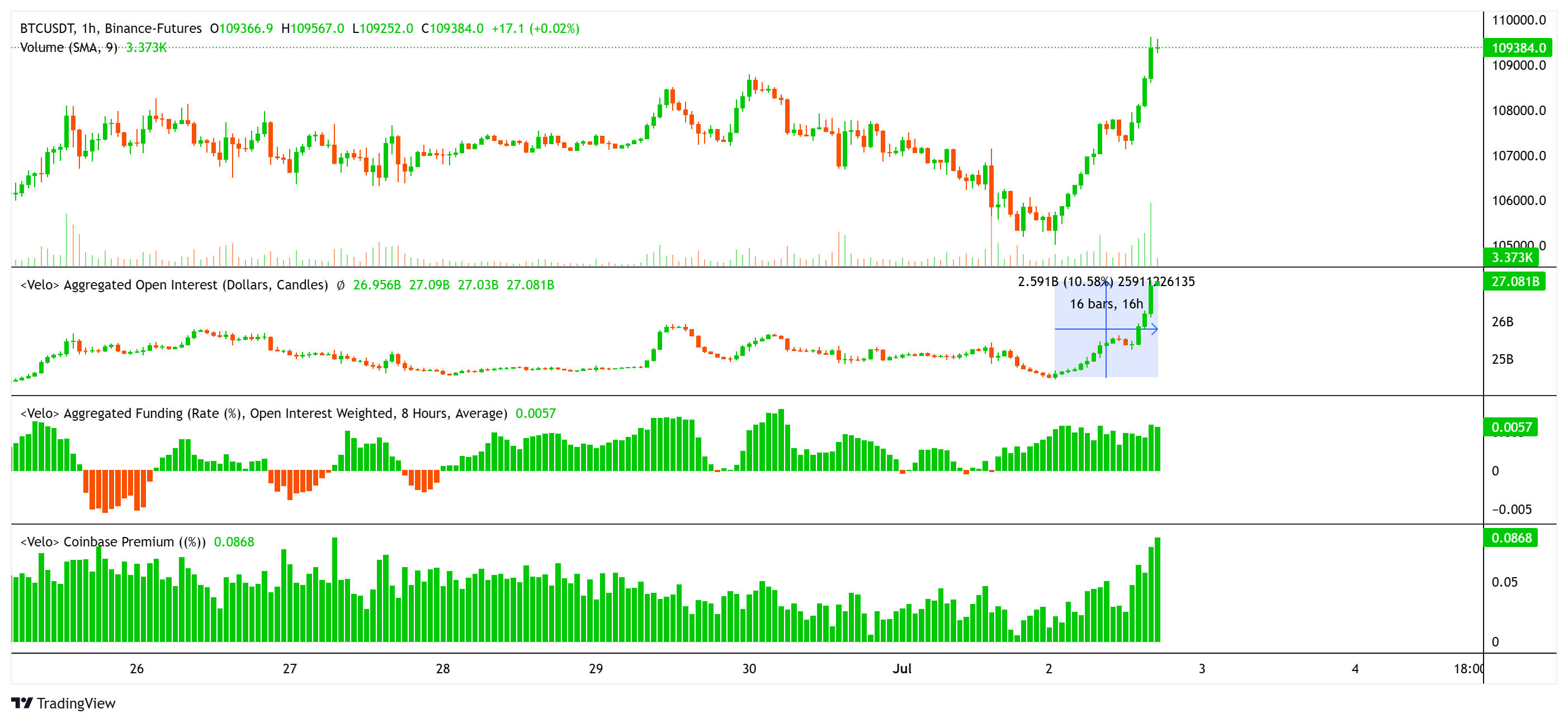 Bitcoin fiyatı, toplam açık pozisyon, finansman oranı ve Coinbase ödülü. Kaynak: Velo.co.