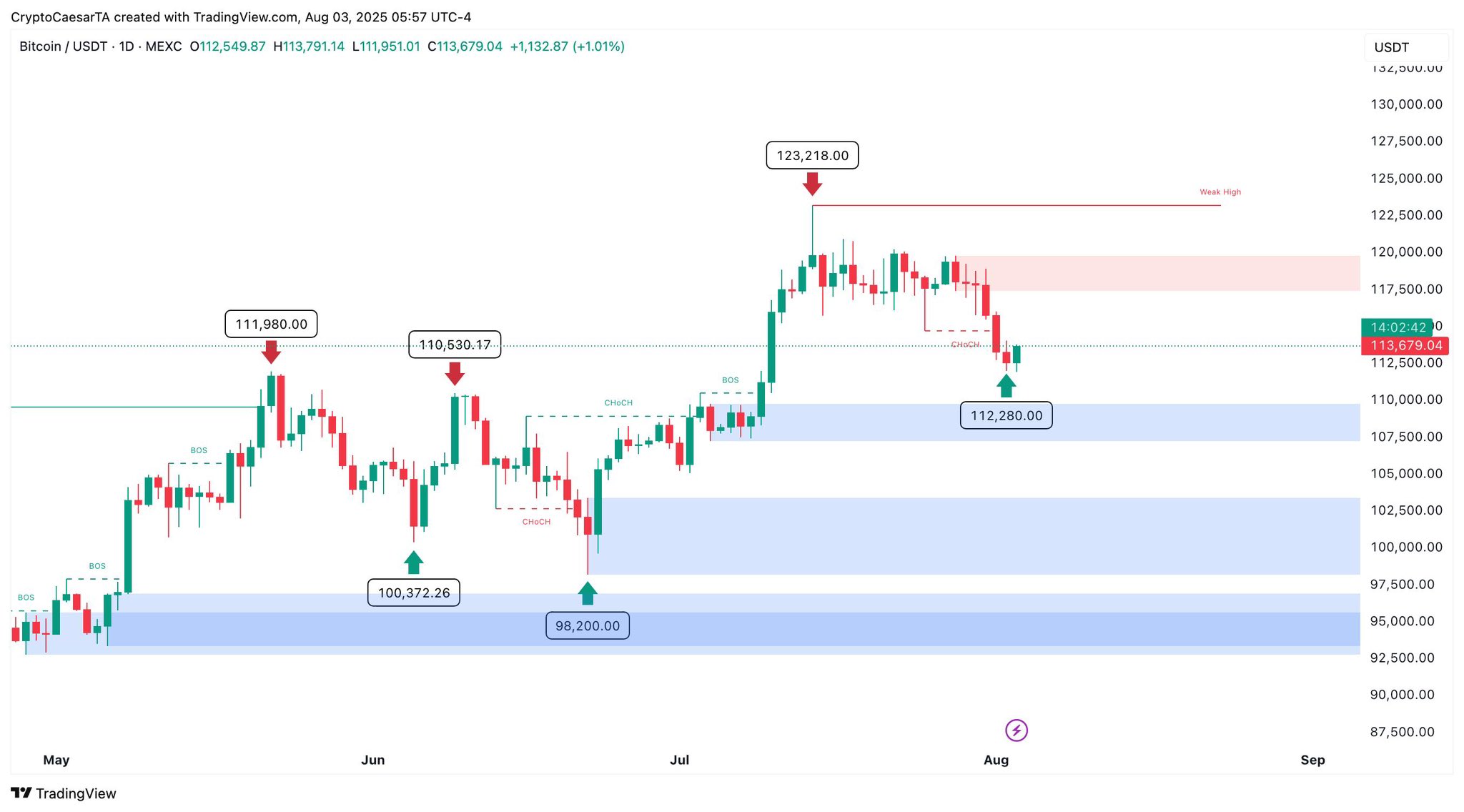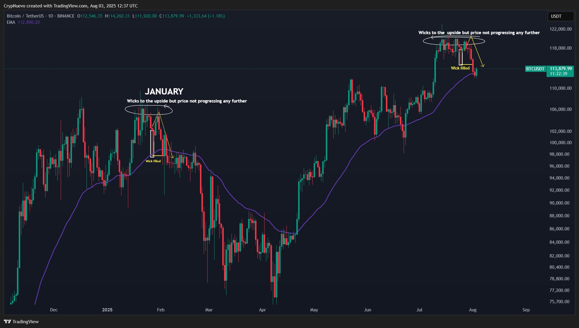 50 günlük EMA trend hattı şu anda 112.900 dolar civarında ve fiyatı 2 Ağustos'ta sadece bir kez bu seviyenin altındaki günlük kapanışta.