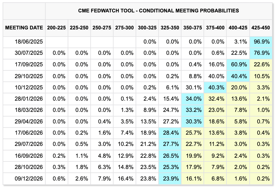 Fedwatch aracının aracından CME grubunun en son en son verileri, piyasaların Fed'in faiz oranlarının bir sonraki azaltılmasının Eylül toplantısını değerlendirdiğini göstermektedir. 18 Haziran'da gerçekleşecek olan Federal Açık Piyasa Komitesi toplantısında (FOMC) faiz oranları faiz oranlarını değiştirmemelidir.