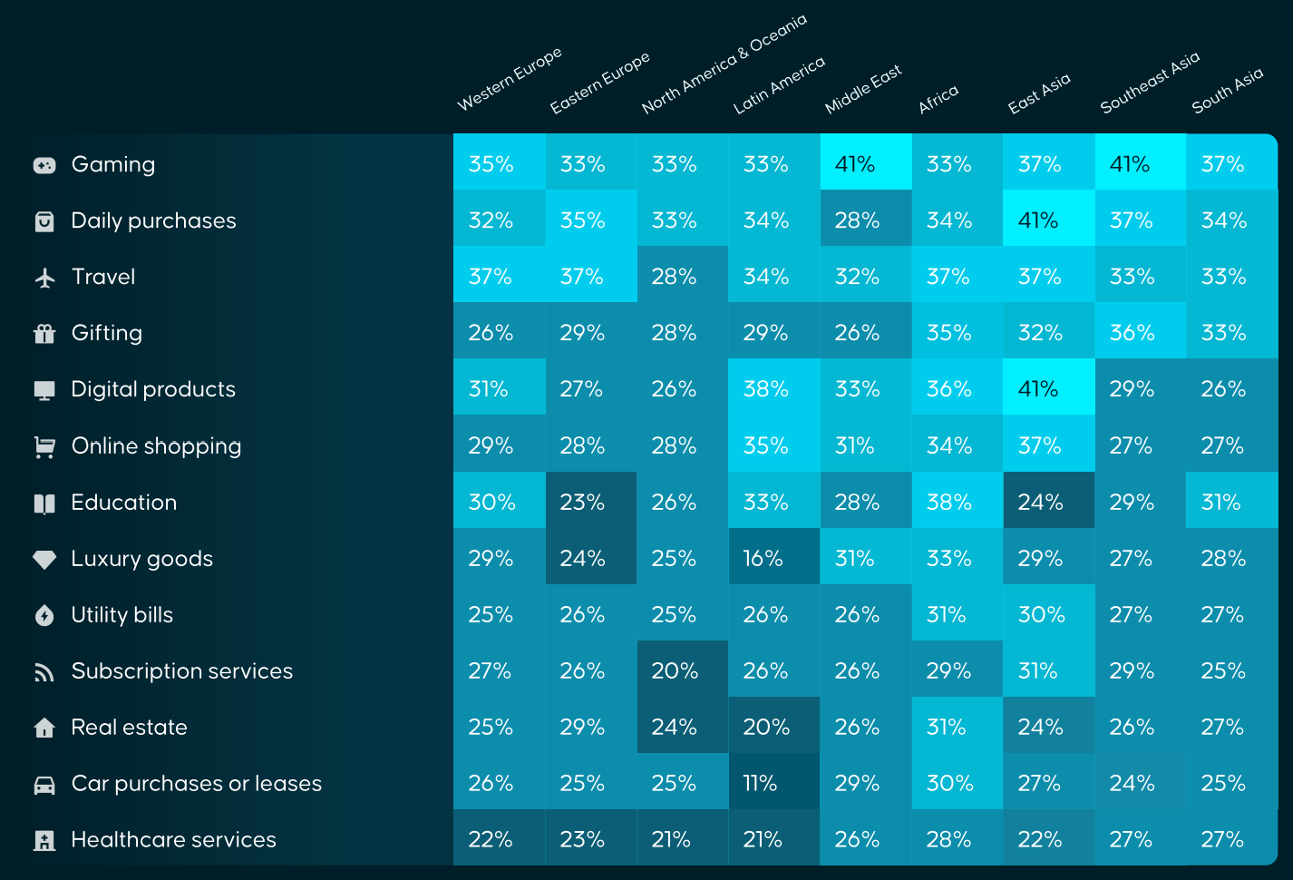 South -Eest Asya, oyun ve hediyeler kategorilerinde ayırt edilir. Kullanıcıların yüzde 41'i bu alanlarda kripto para birimleri kullanmak istiyor. Doğu Asya'da, Crypton'un günlük alışveriş ve dijital ürünlerde rolü, küresel olarak en yüksek oran olan yüzde 41'e ulaşıyor.