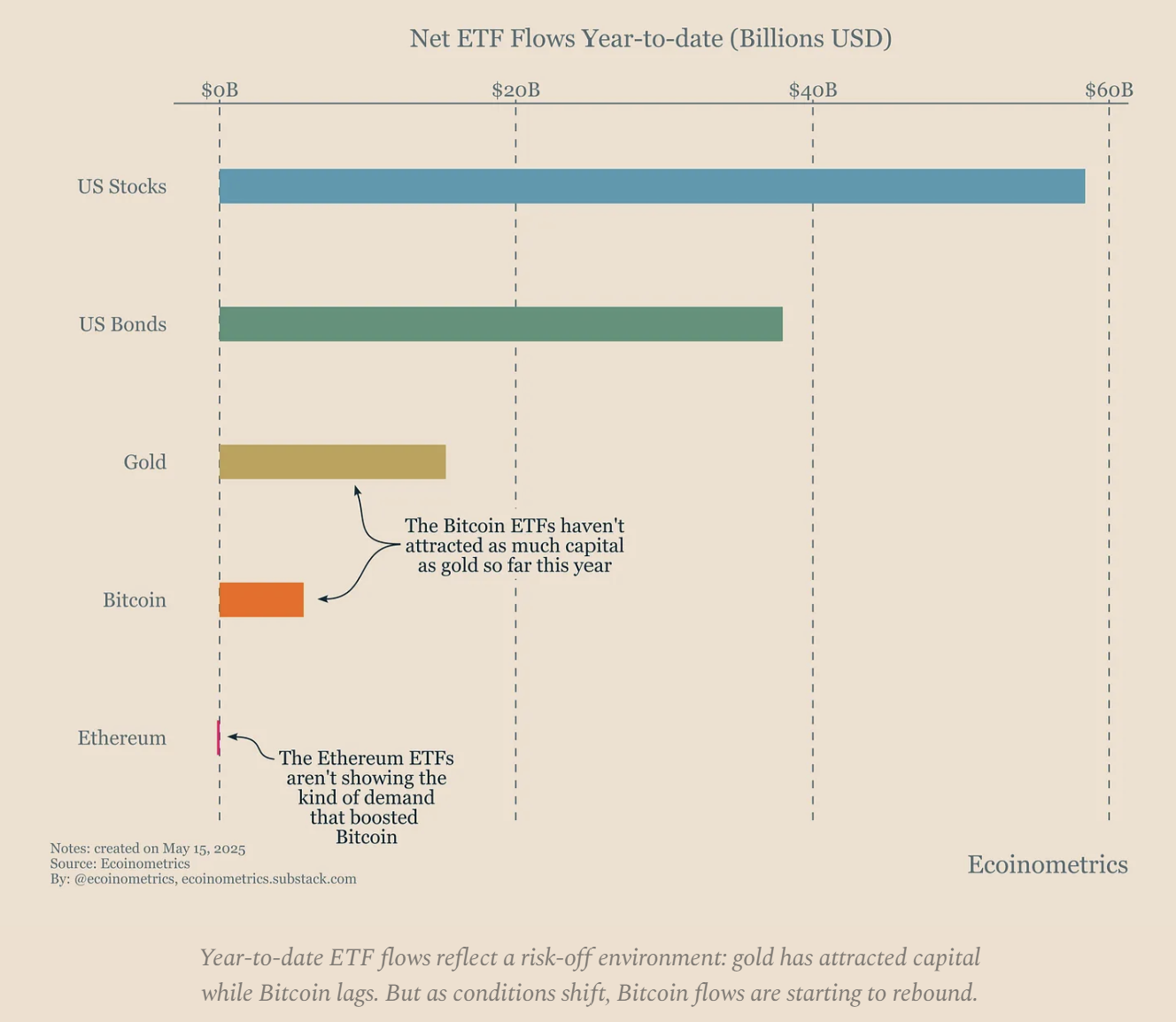 2024 yılında, Bitcoin Spot (ETF) Menkul Kıymetler Borsası'na yapılan yatırım fonlarının toplam net girişi 35 milyar dolar, 500.000 BTC satın alındı ve yüzde 120 kazandı. Ancak, 2025 farklı başladı. İlk dört ay içinde, ETF bitcoin girişleri 2024'ün üçte birinden daha az düştü; Altın ETF'ler daha fazla sermaye çekti.