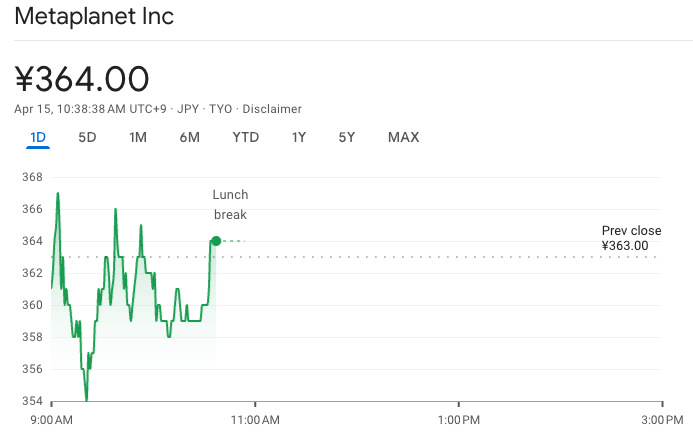 Google Finance verilerine göre, Metaplanet (3350), 14 Nisan’da yüzde 3,71 artışla kapatıldıktan sonra 15 Nisan’da Tokyo Borsası’ndaki Mezzogiorno tatillerinde yüzde 0,5 kaybetti.