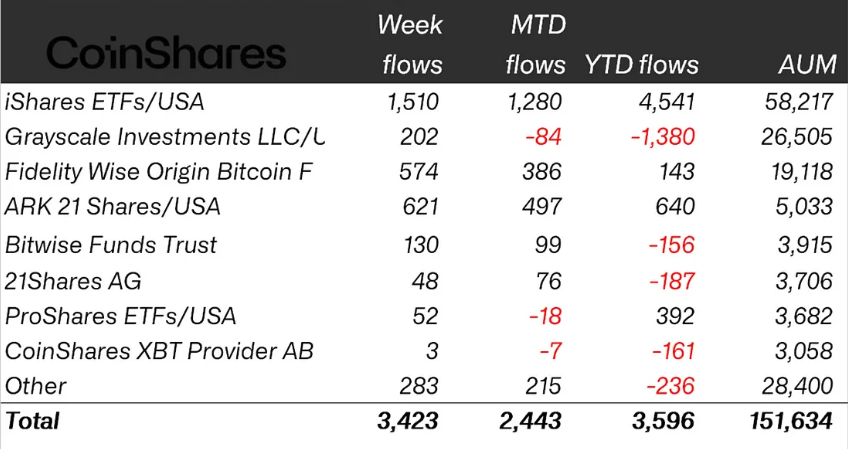 Geçen hafta BlackRock ushares ETF'leri 1.5 milyar dolar ile en büyük girişleri görürken, Ark bunu 621 milyon dolar ve 574 milyon dolar ile takip etti.