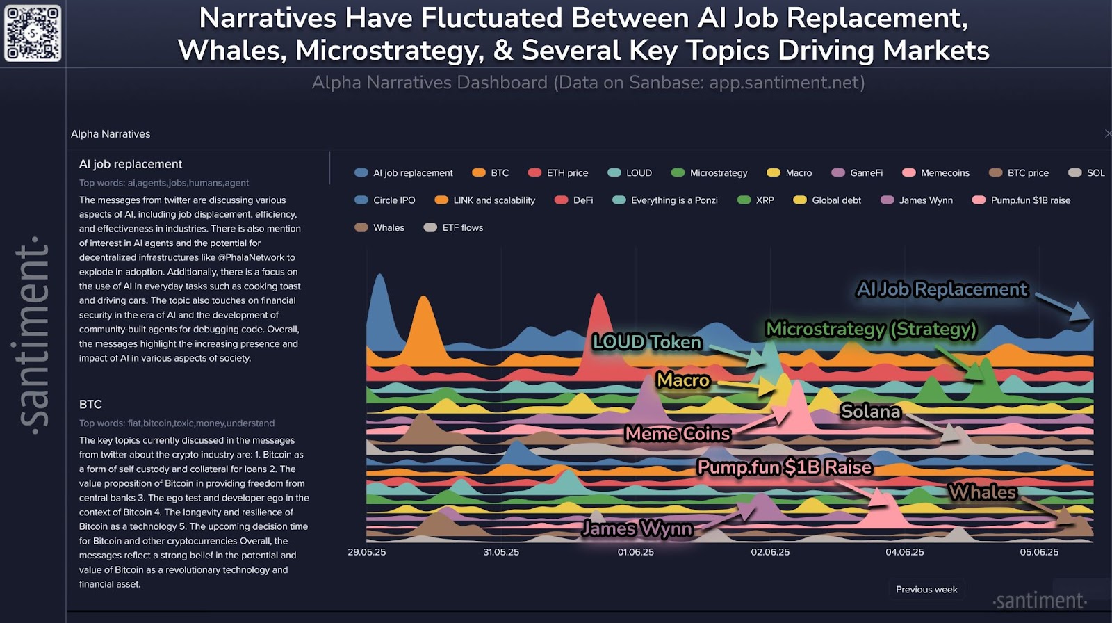Santimment'in alfa anlatıları paneli, kullanıcıların 29 Mayıs ve 5 Haziran arasında X gibi çeşitli sosyal medya platformlarında kripto para biriminden daha fazla yapay zekadan bahsettiklerini göstermiştir. İplik sorunları arasında sektörlerdeki iş kaybı, üretkenlik ve faaliyetler yer alıyor. Bu sonuçlar 9 Haziran'da X'in paylaşımına dahil edildi.