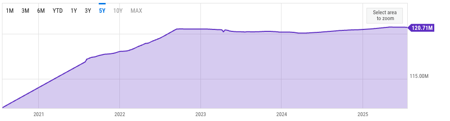 O zamandan beri, teklif kademeli olarak büyümeye devam etti ve yazma sırasında yaklaşık 120.7 milyon ETH seviyesine ulaştı.