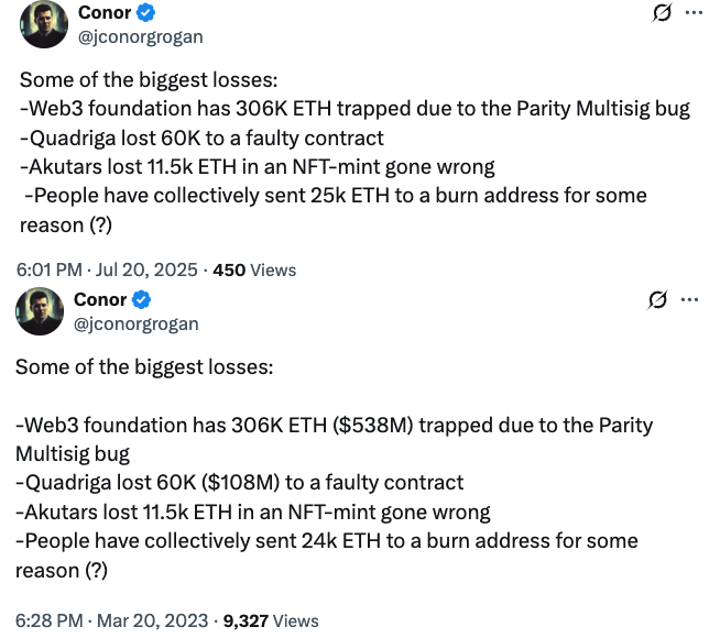 Mart 2023'teki benzer bir rapora göre, Ether'in teklifi yazılımdaki hatalar nedeniyle kayboldu ve kullanıcı hataları o anda 636.000 ETH'ye göre yüzde 44 arttı.