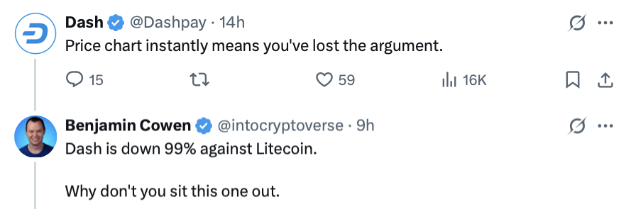 “Dash Litecoin yüzde 99'un altında. Çünkü bu sefer sınırda değilsin, dedi Cowen.