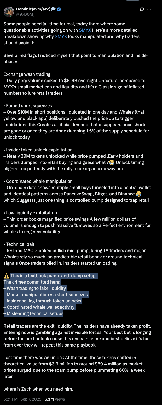 X'te kullanıcılar, MYX hareketini 2025 başında mantranın yüzde 90'ının çöküşüne benzer şekilde bir “aldatma pompası” veya “cezai pozisyon olarak tanımladılar.