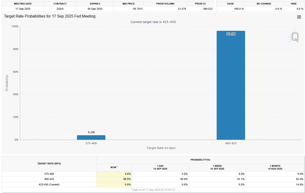 CME Grubu Fedwatch aracına göre, piyasa gözlemcileri Fed kararını yılın en önemlilerinden biri olarak görüyor ve katılımcıların yüzde 96'sı 25 indirim bekliyor. Bu tahmin geçen ay yüzde 85 idi.