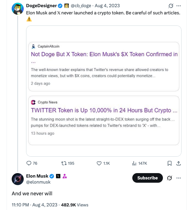 Elon Musk X “Her Şey Uygulaması”, X’in kripto para birimini vermeyi uzun zamandır planladığından şüphelenmedi, ancak Musk Ağustos 2023’te onu açıkça reddetti.
