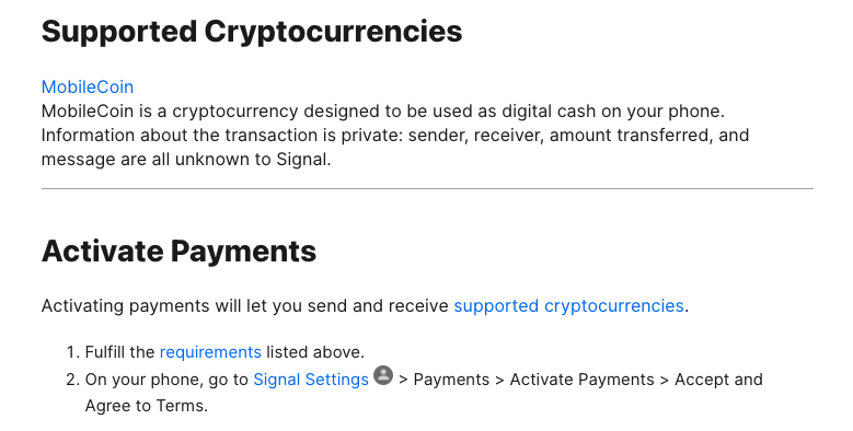 Sinyal web sitesi, Messenger’da desteklenen tek şifreli para birimi olarak Ex Sentz (Mobilcoin) adını belirler. Kaynak: Sinyal