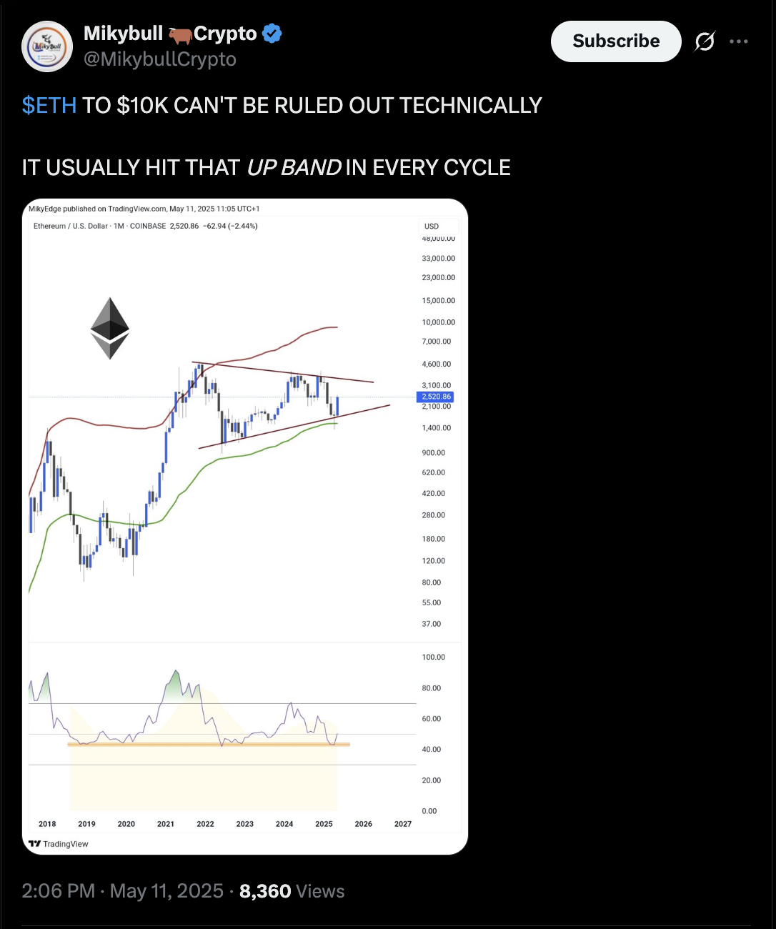 Bu bakış açısını destekleyen Milkybull kripto analisti, Ethereum'un aylık tablosunda benzer bir yapı olduğunu vurguladı ve ETH'nin 10.000 dolarlık yükselişinin “teknik olarak göz ardı edilemeyeceğini” söyledi.