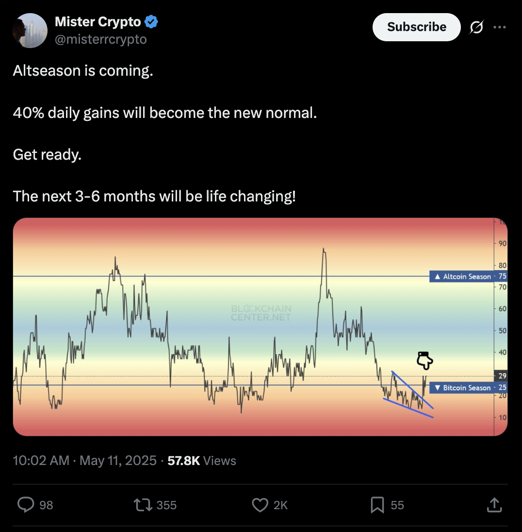 Altcoin sezonunun endeksi 29'dan daha az bir düşüş eğilimi ile yukarı doğru kırıldı, bu da Bitcoin'in alanından uzaklaşma olasılığını gösteriyor. Hala “Bitcoin sezonunda” olmasına rağmen (25'in altında), Breaking ve ETH gibi altcoin'in yakında daha iyi çalışmaya başlayabileceğini ima eder.