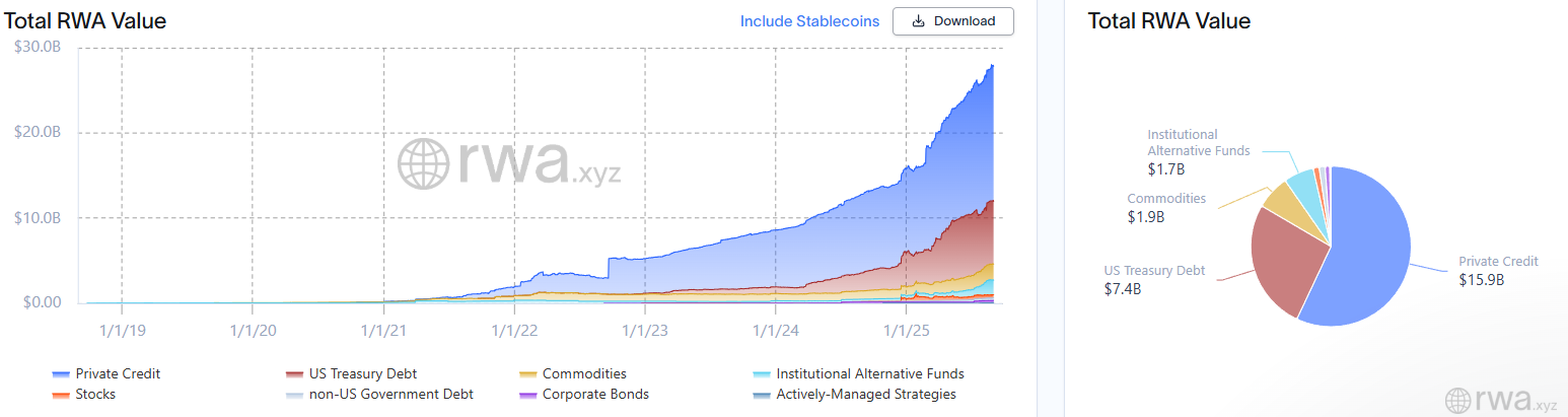 Özel krediler ve ABD hazine bağları gibi alınmış finansal ürünler kurumlar için odak noktası haline gelmiştir. RWA.XYZ verilerine göre, tokenize özel krediler toplam 27,8 milyar dolar -over RWAS'ı, yani 15,9 milyar dolarlık bir fiyatı temsil ediyor ve ABD Hazine tahvillerini 7,4 milyar dolarlık bir değerle takip ediyor.