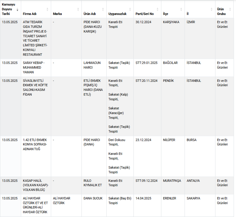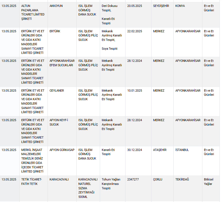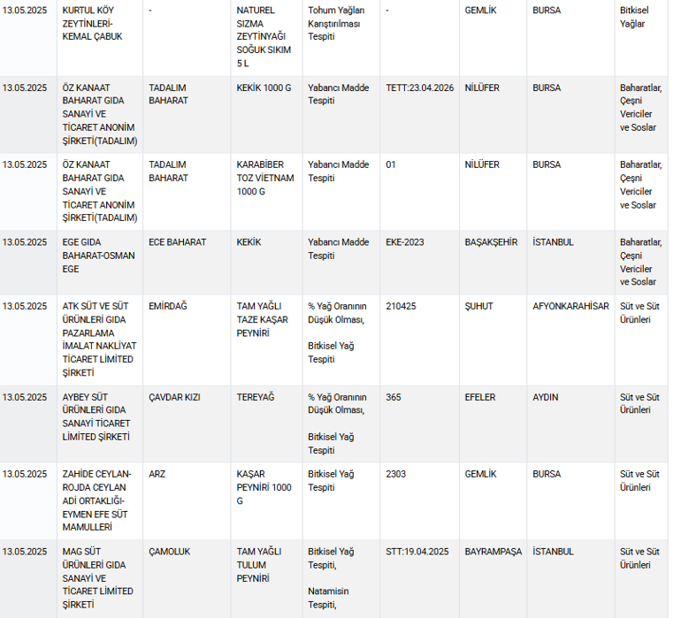 Bakanlık ayrıca sağlığı tehlikeye atacak gıda listesini de açıkladı. Bu listede bulunan ürünlerin halk sağlığını tehlikeye attığı ortaya çıktı. Listede kullanıma yetkili olmayan gıda boyası, Anacardi ve Sumac'ın ürünlerine eklendi.