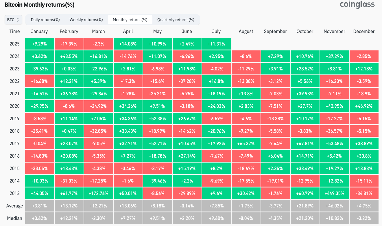 Karşı veriler, BTC/USD'nin Temmuz 2025'te yüzde 11,3 arttığını ve bu oranın son 12 yılın ortalamasının biraz üzerinde olduğunu gösteriyor.