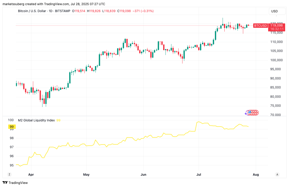 BTC/USD 1 günlük grafik ve Global M2 likiditesi. Kaynak: Cointlegraph/TradingView