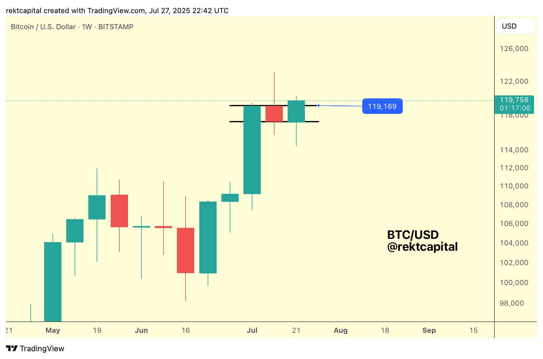 Yatırımcı ve analist Rek Capital, Bitcoin'in haftalık kapanışla 119.450 dolar ile bir boğa Stendardo kurduğunu söyledi.