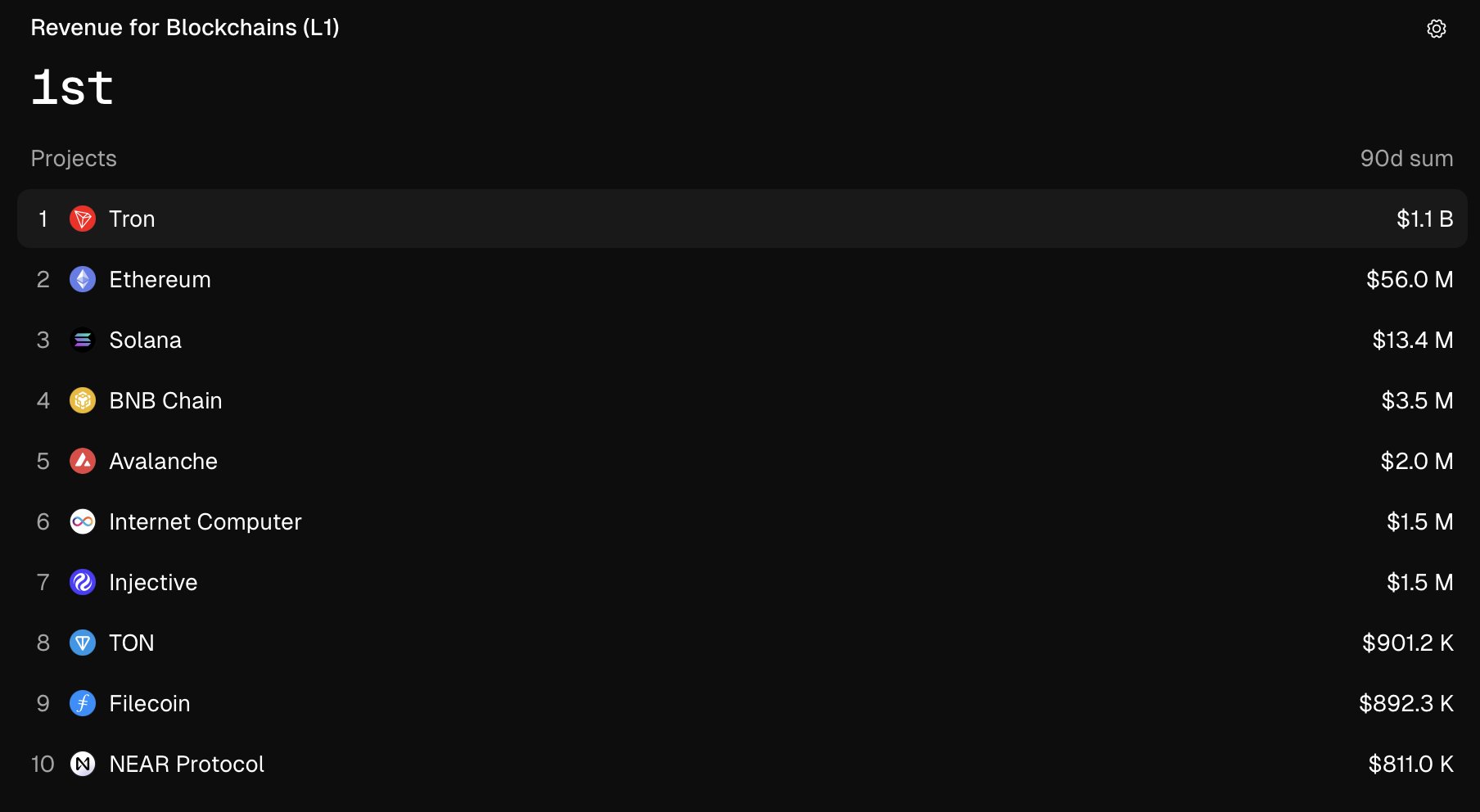 Son yedi gün içinde Tron, Ethereum, Solana, BNB zinciri ve çığ önündeki birinci seviye ağlarının önündeki birinci seviye ağlar arasında toplam gelirin yüzde 92,8'ini yakaladı. Tron işlem komisyonları son 90 günde 1.1 milyar dolara ulaştı.