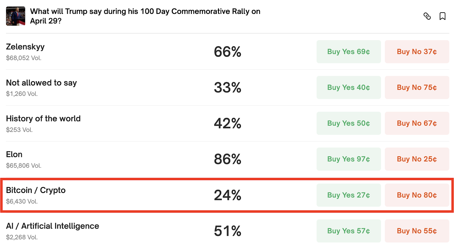 Polymarket'in kripto para birimi bahis platformu, Trump'ın bugünkü yüzüncü günlük konuşması, “kripto” veya “bitcoin” kelimeleri hakkında yüzde 24 olarak konuşma olasılığını tahmin ediyor. Platform verileri, kullanıcıların etkinlikte 1 milyon dolardan fazla bahis oynadığını gösterdi.